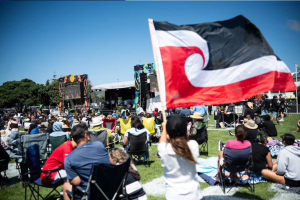 Crowds gather at an outdoor festival in Porirua, with performers on stage and people seated on the grass, some holding a tino rangatiratanga flag.