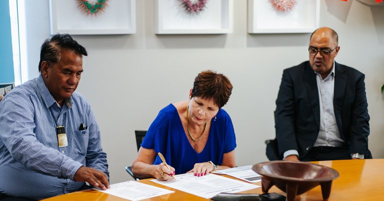 DR PARAI AND ANITA BAKER Ngāti Toa kaumatua Dr Taku Parai and Porirua Mayor Anita Baker sign the statement of commitment.
